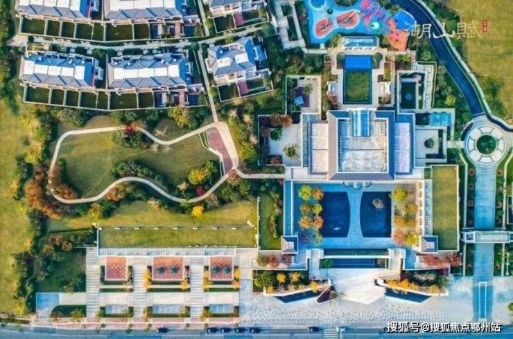 穿过会所,进入别墅区,从高空往下看,一栋栋别墅,前后绿树成荫,间杂运动、休闲、游乐场所,仿若置身公园之中: