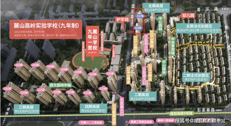 目前项目主推五期高层216#、217#栋,下楼过马路即到学校大门口,直线距离仅约10米!
