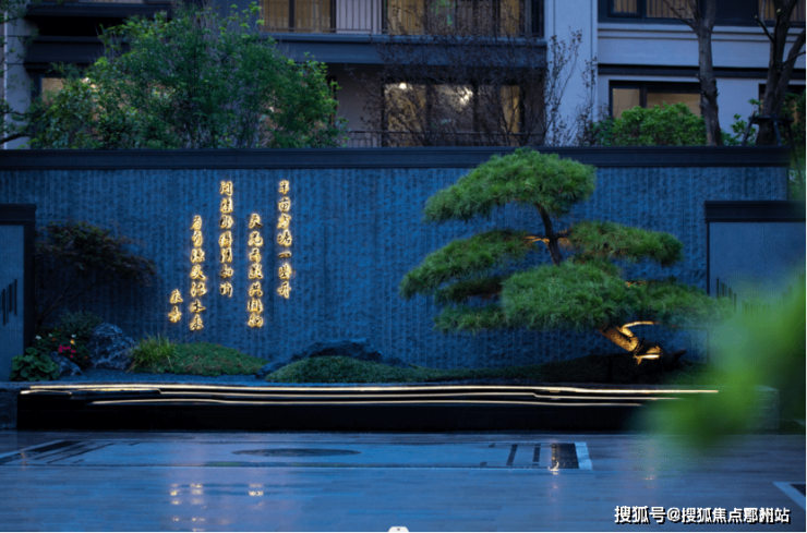 走过气势恢宏的大门,三段式主题诗词景墙映入眼帘,将大门的仪式感延续至社区中轴,景墙前水景池叠瀑设计,