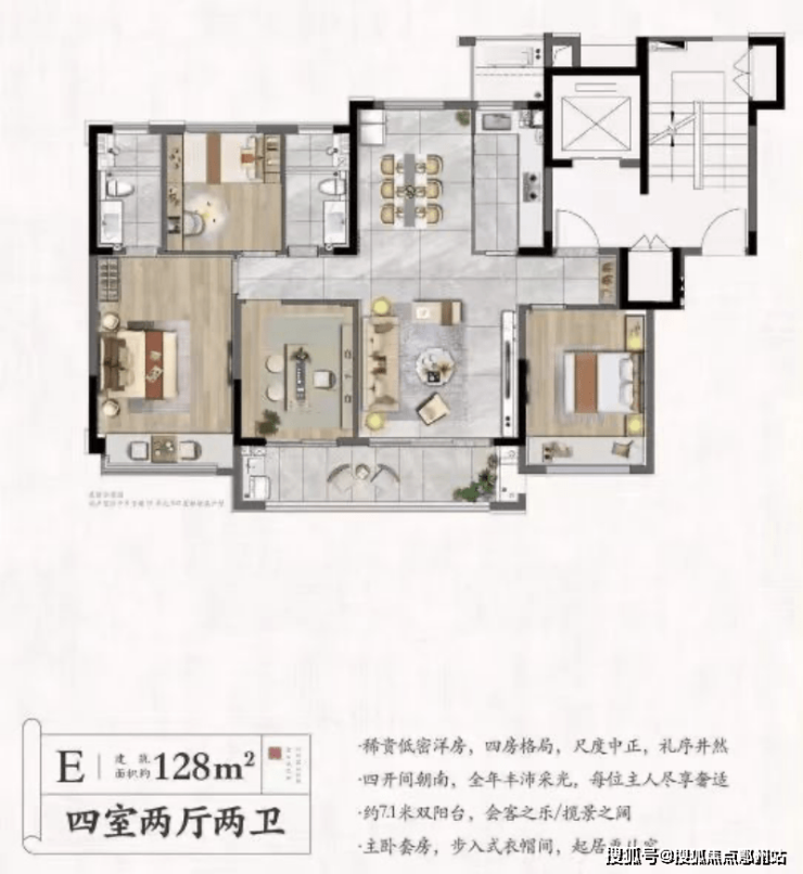 约128㎡爆款户型, 得房率约84%,实际使用面积约108㎡;对比市面上同等面积的高层房源,得房率普遍在75%,实际面积约96㎡;