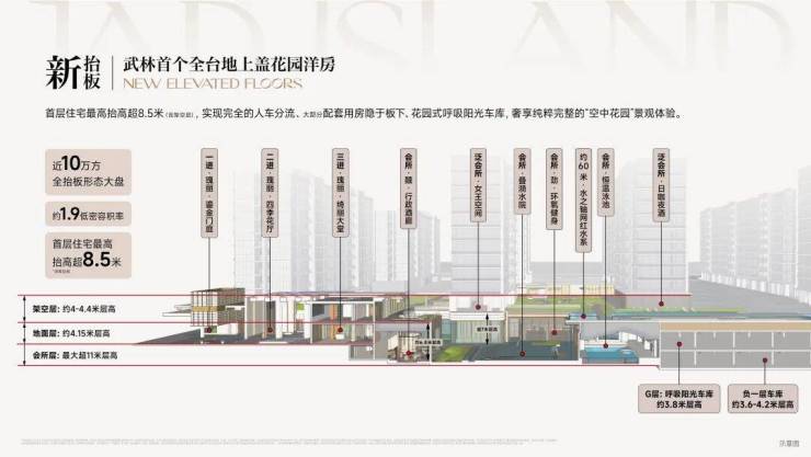 项目的领先性还体现在利用建筑新规创新设计「 板块首个全台地上盖花园洋房 」,整个小区通过约4.15米高的抬升,把“不利因素”隐藏起来,社区实现了彻底的人车分流。即便是洋房,2楼也相当于以往楼盘3-4楼高度,带来的是更优越的采光、通风,以及观景视野。