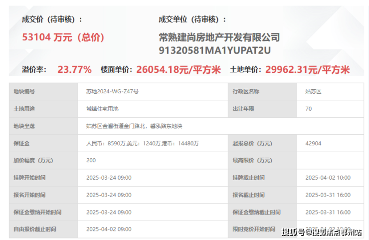 建发金门47号地块项目,即,苏地2024-WG-Z47号地块,位于姑苏区金阊街道金门路北,馨泓路东地块,4月2日,建发以总价53104万元竞得,成交楼面价26054元/平,溢价率23.77%。
