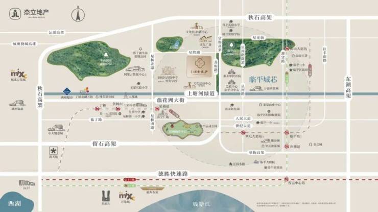 1、【三山一水,四面皆景】临平山、皋亭山、丁山、上塘河环绕,山水与建筑围合,形成藏风聚气的灵秀宝地,四面满目皆景。