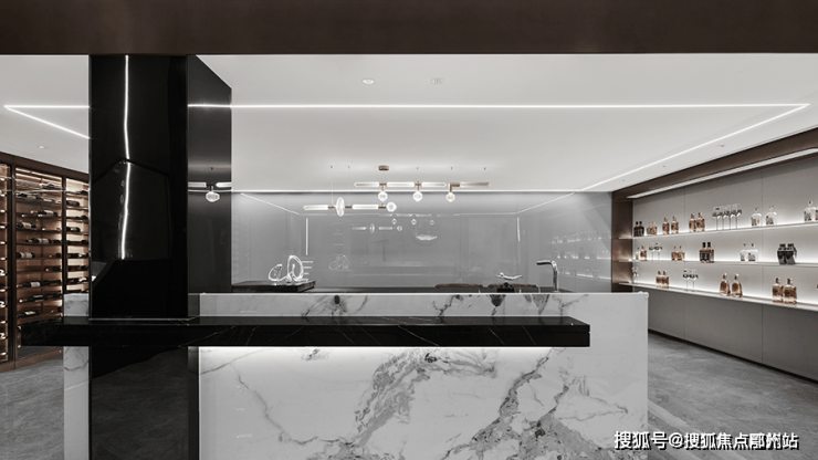 穿过岛台 另一侧是品酒室,大面积玻璃与石材细腻的纹路相结合,在起承转合间能够捕捉到,彼此细腻的纹理与形态,