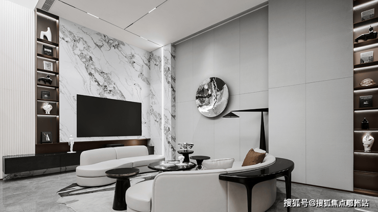 客厅在多重材质的组合下,顺畅融汇 秩序井然素雅的基调来自比例的精准把控和色彩的考究搭配,克制之间彰显出游刃有余的平衡之道!