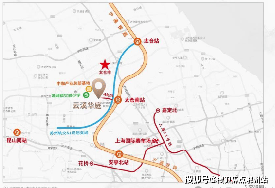 云溪华庭直线距离约4KM直达太仓南站(数据来源:百度地图),沪通高铁、沪宜高速两大立体交通网络接轨上海虹桥枢钮、上海嘉定等区域,此外,未来的苏州轨道S1支线(规划中)也有望串联太仓南站、太仓站,昆山到太仓的通勤时间将大幅缩短,上海轨交11号线也有望接入太仓南站(规划中)进一步提速虹桥北,未来热土新纪元。