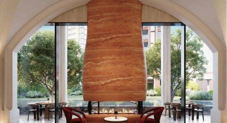 大堂位于主入口。米白色调为主,中辅以温暖红橘色调,拱形吊顶、铁艺花门和拼贴机理大理石地面交织复古与现代。枝形吊灯散发出艺术光芒,红洞石装置与室外红砖立面遥相呼应。复古橘色非围合沙发洋溢着温情,四向座席无主次之分望向室内或花园,四向皆景。