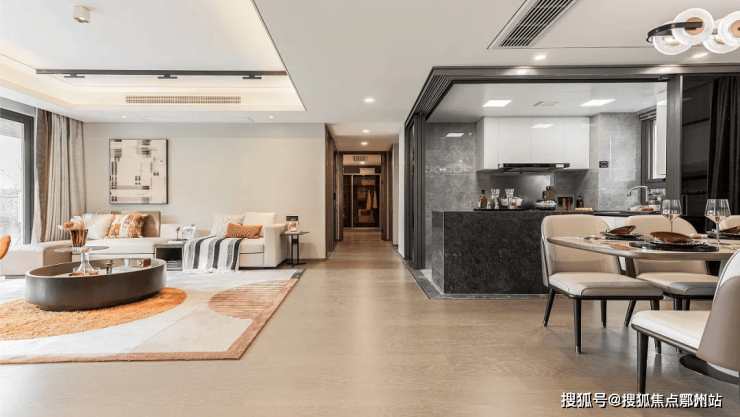 建面约114㎡户型将客厅、餐厅和厨房打通成为一个完整空间,人与人之间可以更好地沟通、互动,充分植入会客、娱乐、餐厅、休闲、聚会等功能,同时保证了每户具有良好的观景视野。