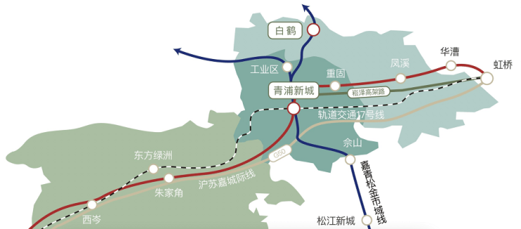 市域铁路:未来市域铁路嘉青松金线,将贯穿嘉定、青浦、松江和金山,届时白鹤将与青浦新城直接连通,并换乘轨交17号线和沪苏嘉城际线。