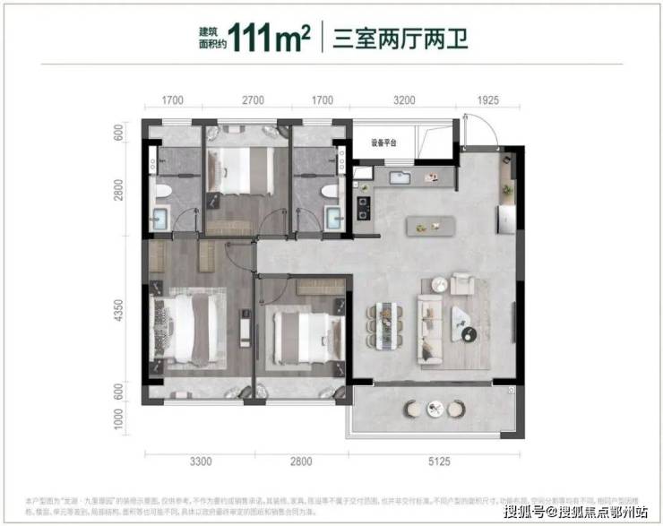 111㎡的户型属于主流横厅,但是开间只有5米多,餐厅略微拥挤。