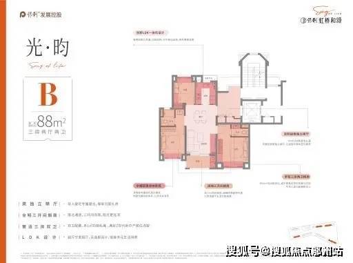 臻奢建面约88㎡/99㎡户型,专属定制类独立梯厅,让生活拥抱私密和尊崇,LDK餐客厨一体化设计,动线流畅,