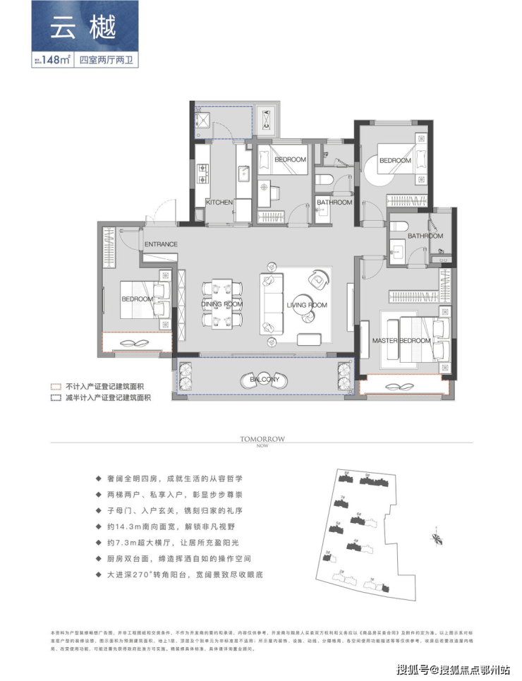 建筑面积约148㎡ 四室两厅两卫,两梯两户设计,重塑归家仪式,阔绰子母门,入户双玄关,约7.3m横厅开间,主卧套房,独立卫浴尊享私属,南北双阳台,延伸景观视野