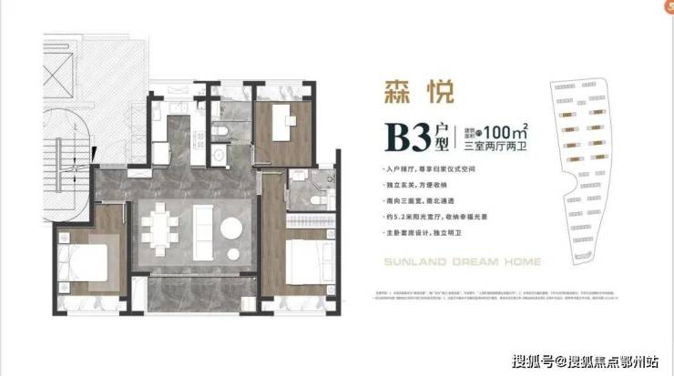 项目建面约100㎡就能享受时下更受年轻人青睐的大横厅户型,厅宽达约5.2米,配上大尺度阳台,整个社交区域方正、阔绰,待客、休闲皆从容自在。