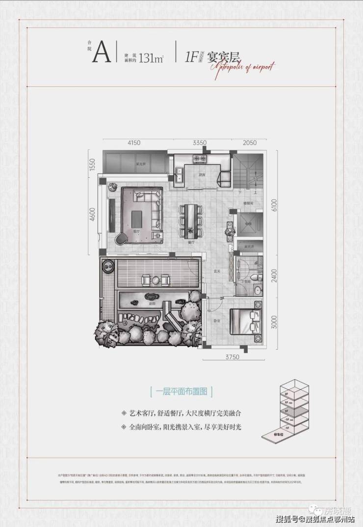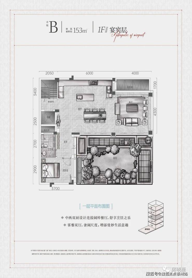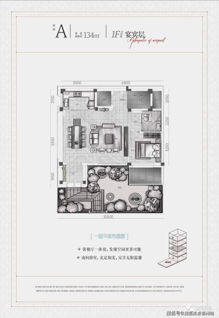 1F“宴宾层”,连接地面庭院,为客/餐厅、厨房所在楼层,另配备一间客卧;