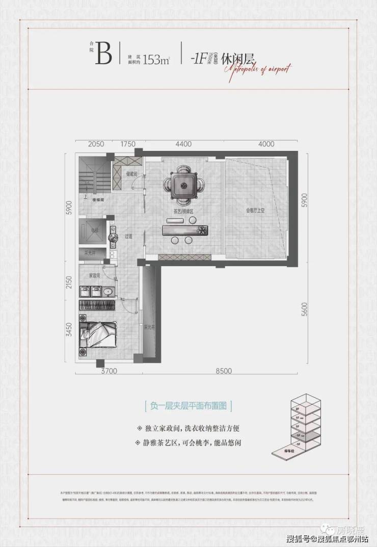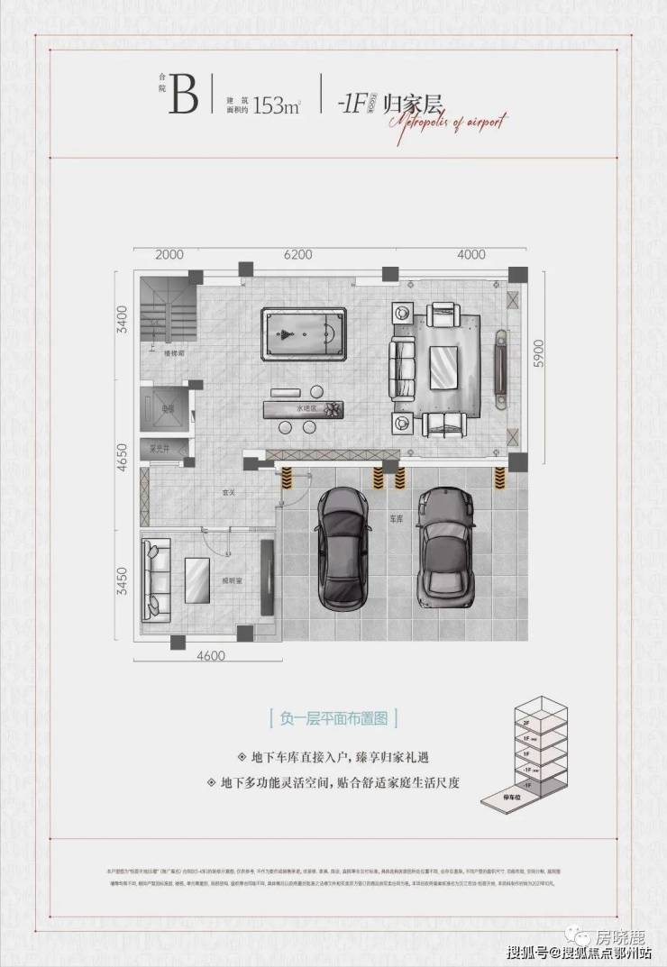 -1F“归家层”实际为地下第2层,为车库(每户2个)、会客厅、棋牌室、影音室(或KTV)、健身室等;