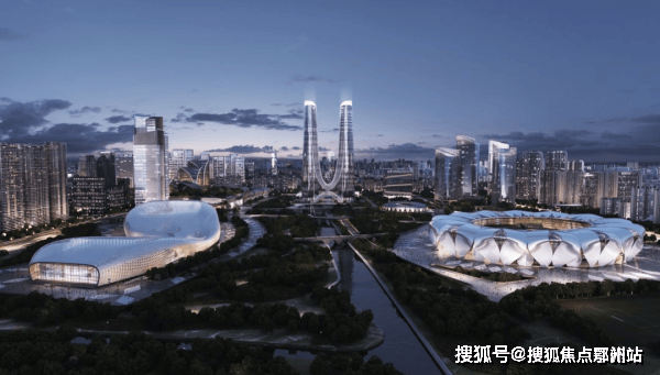 勾勒出城市崭新的天际线。双塔中间相连的弧线借鉴了杭州的特色景观——西湖断桥、