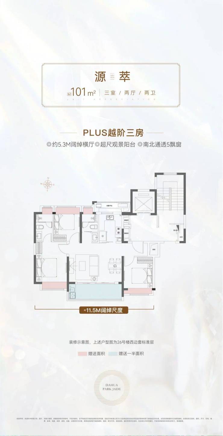 经典飞机户型+三开间朝南+餐客厨一体化+约5.3m的阔绰横厅,整体南向面宽达到约11.5m! 整个户型的通透度和采光度很棒。