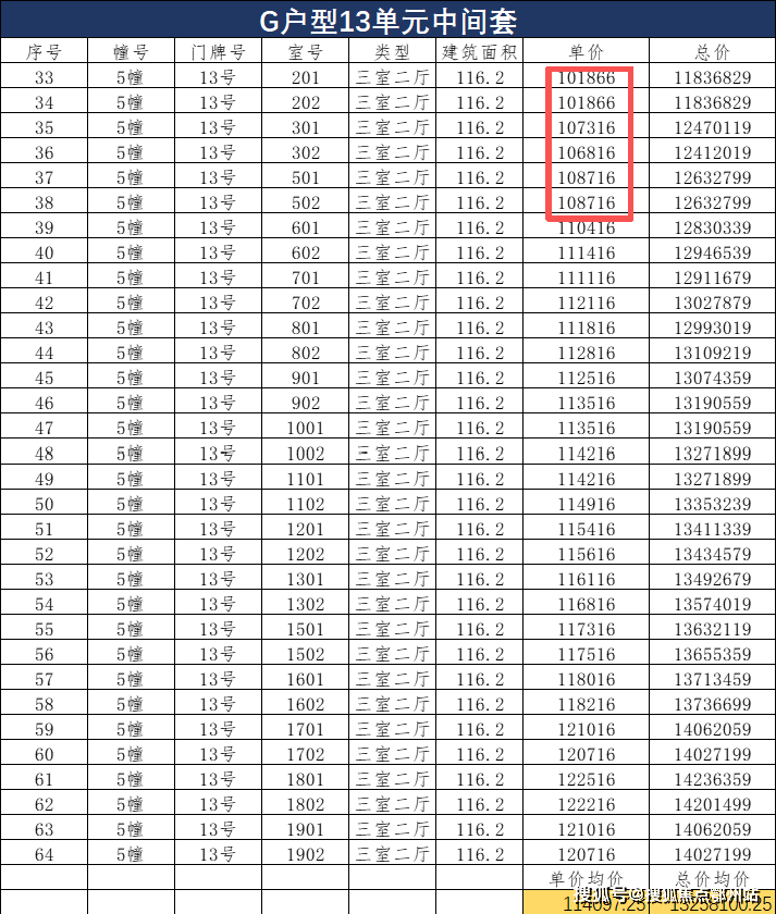 中间套G户型119㎡三室两厅两卫,单价均价约11.40万/㎡,总价均价约1316万。