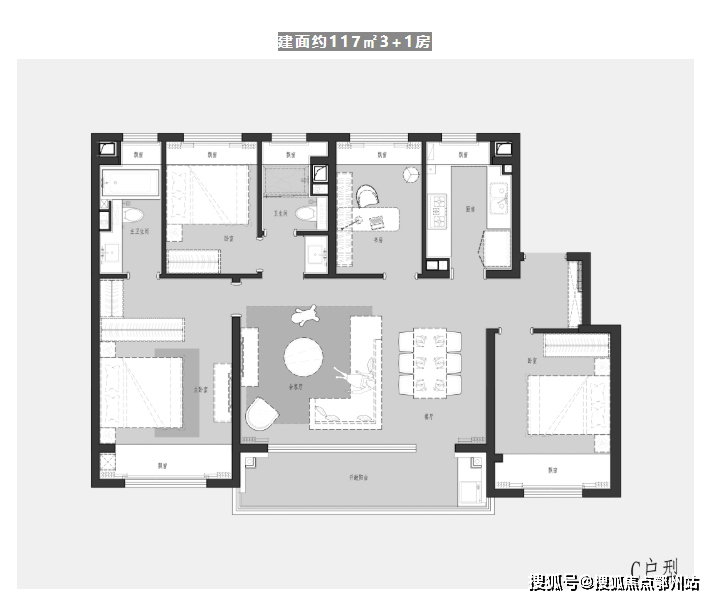 建面约117㎡3+1房,空间尺度堪比130㎡,花3房的钱得4房的功能和空间!