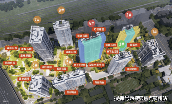 万科公园5号由公共通道分割为了南北两个小地块,东西两个组团各4栋楼,1-4#为东组团,5-8#为西组团。