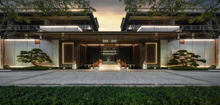 三重屋檐,代表天地人融合的东方宫殿最高等级,上檐、外檐、下檐三重结构,现代立面,以铝板、格栅、石材、瓦墙型材、玻璃等现代型材,彰显传世之宅的独特气度。摒弃早期中式建筑的白墙黑瓦,精研居住建筑的材质与色彩搭配,注重冷暖的多重对比。中式建筑的立面呈现出的不是粉墙黛瓦,而是「宋韵五色」。