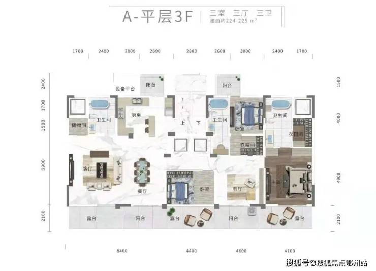 平层还有 建面约213㎡/225㎡三室三厅三卫、 约185㎡/220㎡四室两厅三卫,皆为豪宅尺度。