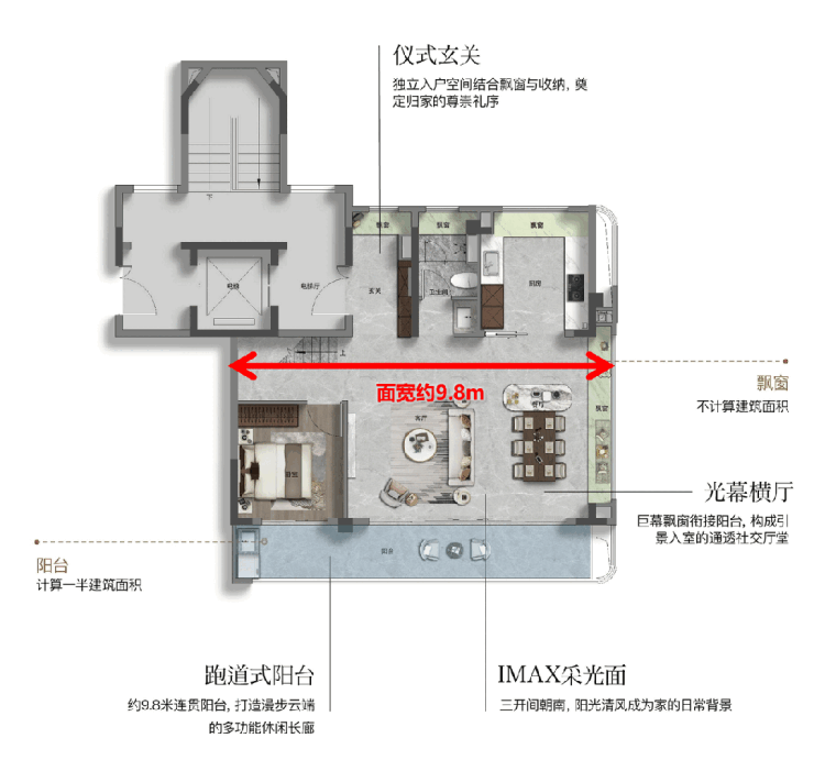 该户型最引人注目的特征是其 约9.8米的南向三面宽 , 三个南向阳台贯通连接 ,形成罕见的“跑道式”超大阳台,将室内生活场景无限向外延伸。
