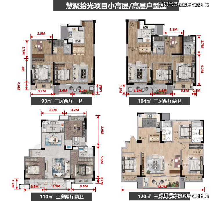 慧聚拾光项目有高层及洋房两种业态,高层打造两梯四户,建面约93㎡三房两厅一卫及建面约104㎡三房两厅两卫产品,其中建面约93㎡为中间户,建面约104㎡为边户;