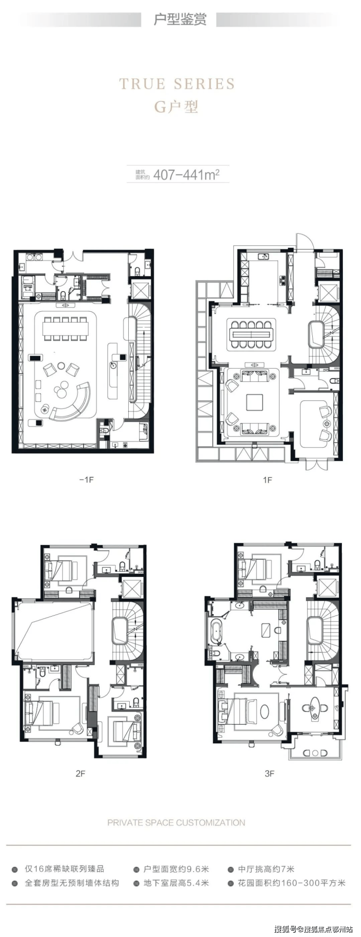 在售户型: 建面约310-410平米,地上三层地下一层