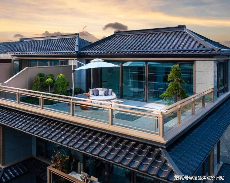三重屋檐,代表天地人融合的东方宫殿最高等级,上檐、外檐、下檐三重结构,现代立面,以铝板、格栅、石材、瓦墙型材、玻璃等现代型材,彰显传世之宅的独特气度。