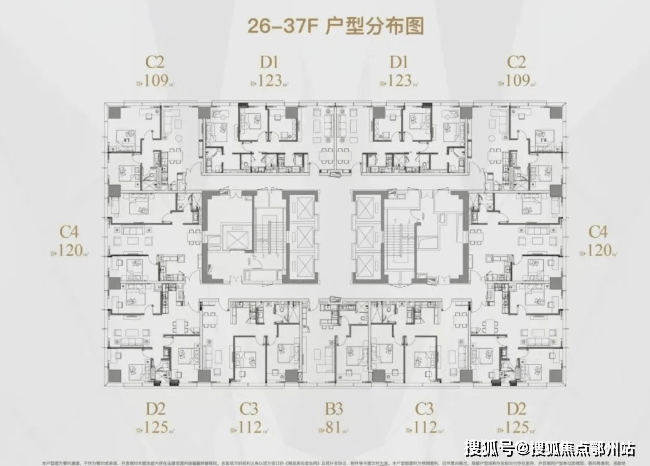 中区是26-37层,户型分别是 80㎡,107㎡,120㎡,125㎡;
