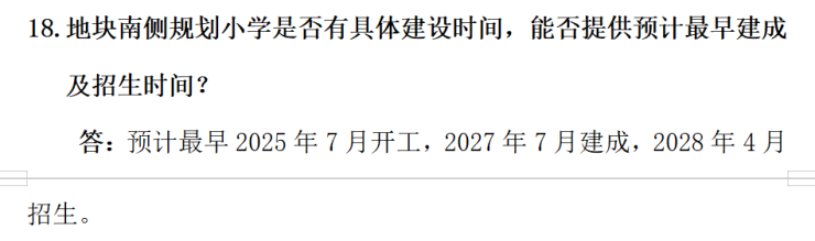 很多人关心目前这里的规划进展如何了?根据该地块的答疑纪要,地块南侧规划小学预计2025年7月开工、2028年4月招生;地块西南侧的中学预计2025年8月开工;地块东侧绿地预计2029年建成!