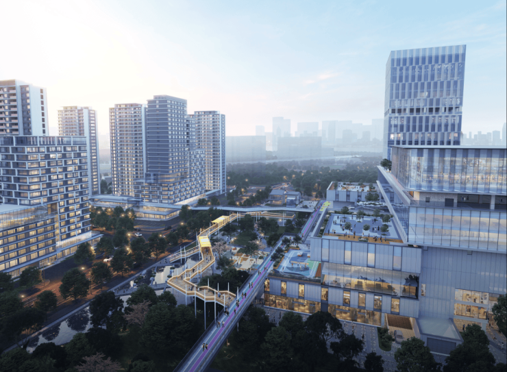 还有公共交通、人行天桥、邻里中心、街区邻里公园、循环型花园等。 建筑地标、核心配套、可持续性的高科技,都在浦南未来社区项目当中体现。 让人不禁联想到奥体亚运村和未科绿汀路TOD。
