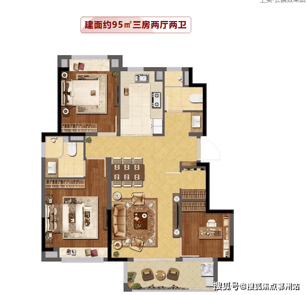 约95㎡三房两厅两卫,做到了三开间朝南+瞰景大阳台+主卧套房设计+南北通透+卫生间干湿分离,该户型得房率和空间利用率都非常高。