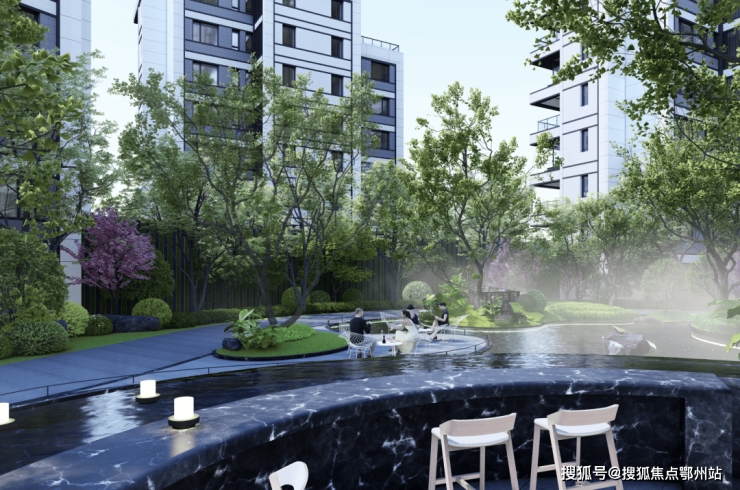 模仿自然生态环境水与陆地比例,设计550㎡水景面积,打造更自然的社区环境,引水入园,造就山水画境