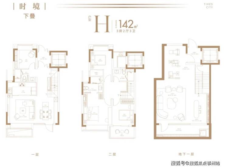 以建面约142㎡下叠为例,地上两层、地下一层阔绰空间,动静科学布局,全面考量三代同堂与二胎家庭的居住空间需求,以人性化质感空间演绎舒奢生活。
