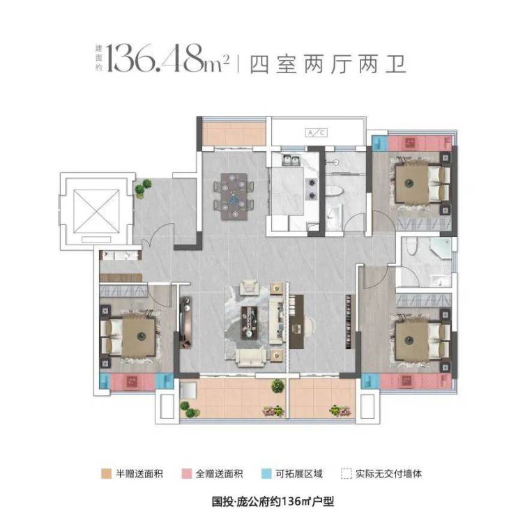 不同的是,国投·庞公府四室户型多一个北向阳台,连接南向阳台的客厅与卧室可灵活设计为大横厅。