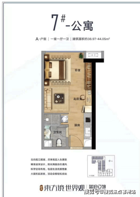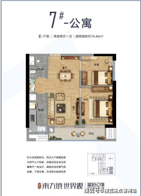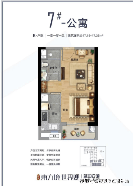 ② 带观景阳台,南向建面约47、77平的平层公寓户型带有观景阳台,增加采光的同时方便生活晾晒。