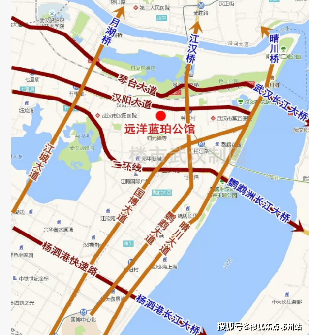 路网:项目距离汉阳大道和鹦鹉大道均在100米内,距离鹦鹉大道转盘500米左右。走鹦鹉大道一路向北约1.5公里过江汉一桥可达武胜路,向东约1.5公里至晴川大道,走晴川桥即到汉正街,向东走鹦鹉洲长江大桥或长江大桥可达武昌。