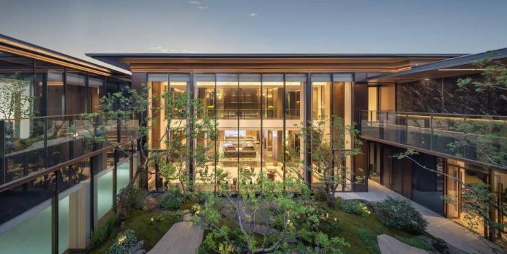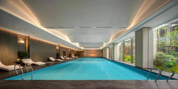 有恒温泳池,是以度假酒店为灵感设计的,通透的落地玻璃窗下与下沉庭院景观相互渗透,实现一年四季畅游的“游泳自由”。