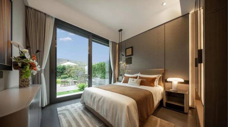 一楼独立套房,方便家里长辈起居;二楼三卧室全朝南,开间都超过10米,全景落地玻璃,风景如画。