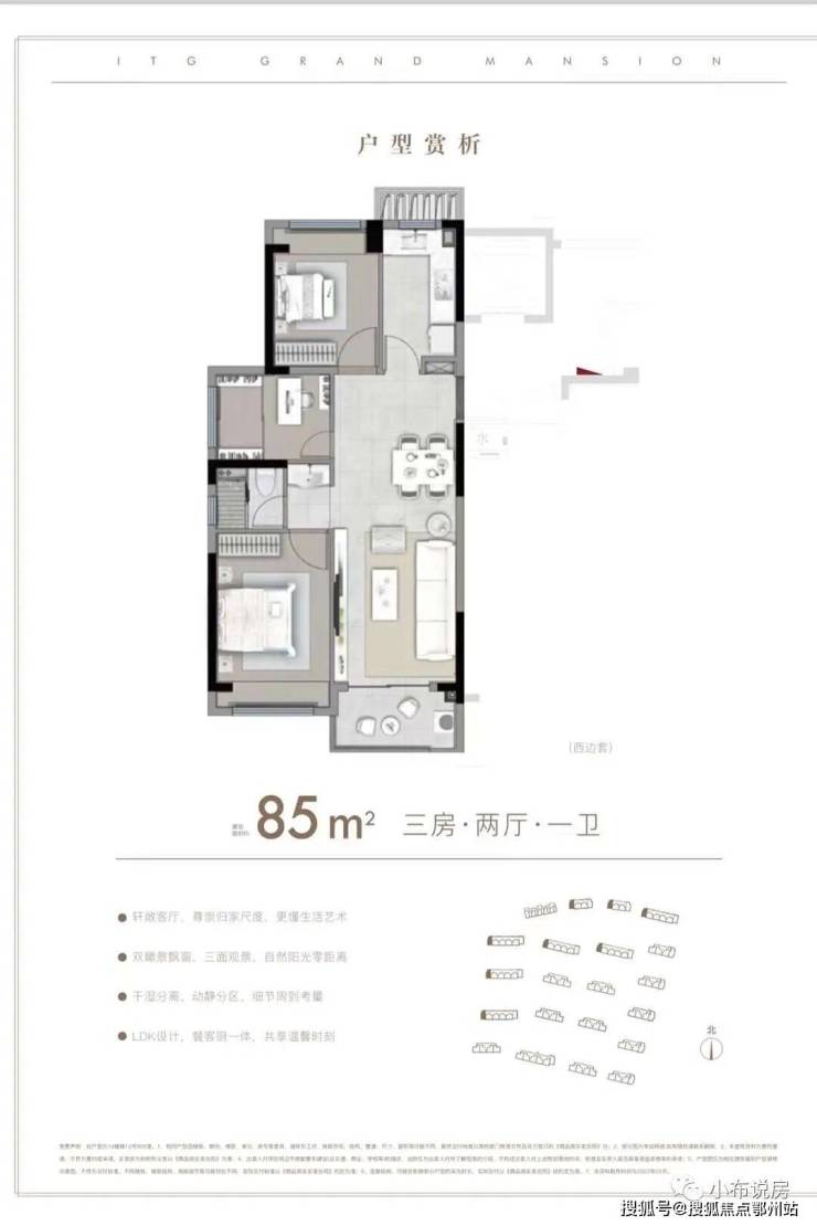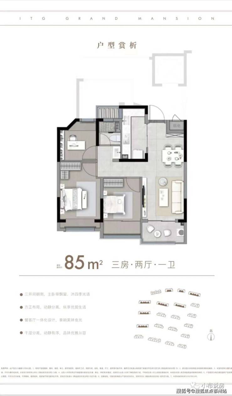 户型解析:约85㎡的3房,这种入门级的产品也要保证居住的尺度感。比如利用L形厨房与餐厅相连接,一体化的设计让空间充足利用。比如次卧连接阳台,就是人性化考虑到给他们一个私密的追光天地。