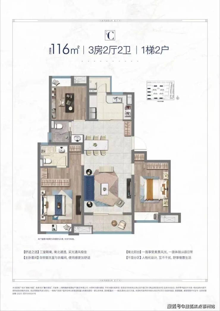 建面约92㎡、116㎡3房2厅2卫户型,这两个户型布局非常相似,都做了三开间朝南+全卧室带飘窗+南北通透+主卧套房设计+卫生间干湿分离,都是3房户型中的翘楚。
