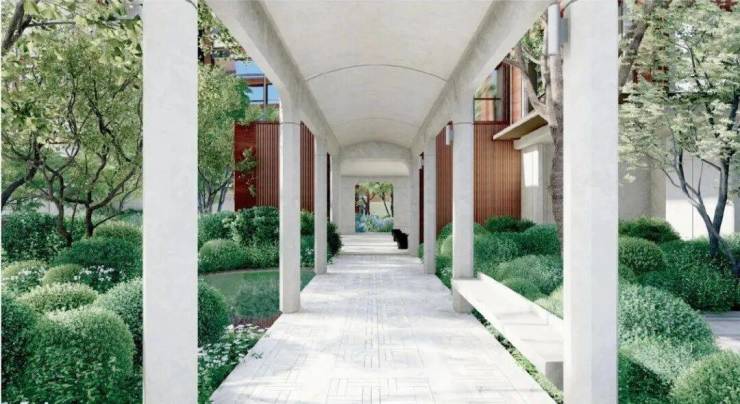 如此一来,每一栋楼的住户都能平等地享受社区会所资源,这种空间结构与“民主人居”的思路不谋而合,堪称先锋布局。渡边智昭先生延续其静谧而高贵的美学,以匠心和艺术灵魂雕塑会所,如一座线性艺术馆,于架空廊下蜿蜒展开,移步换景,在泛会所廊下延展、开合,如东方园林里游园的韵味在空间中浮现。