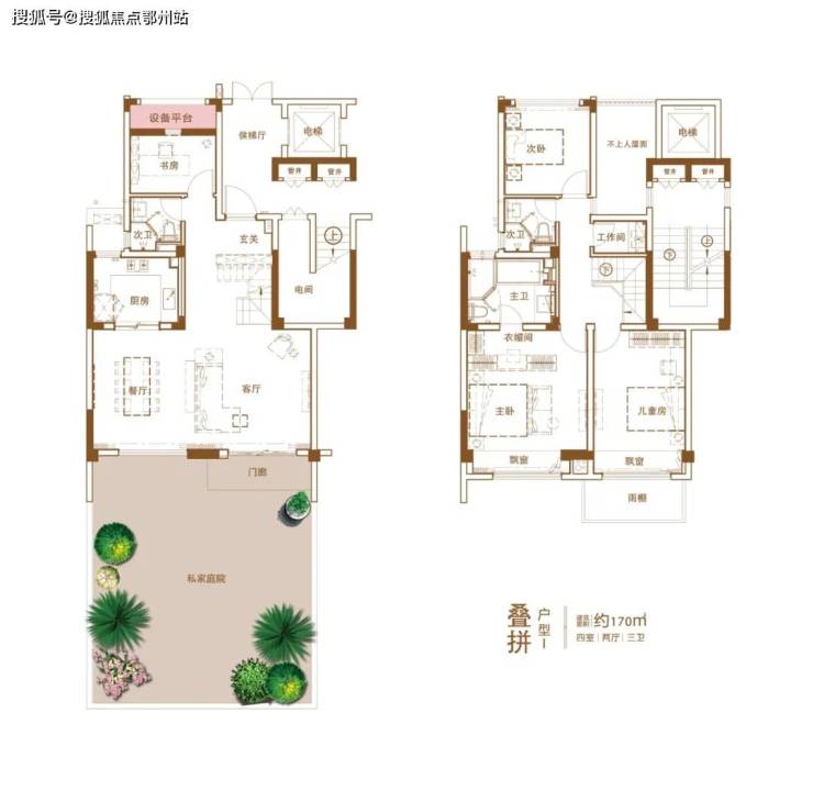 再来看一下叠拼户型,据悉下叠送面积约60平方大花园,上叠赠送面积约20平方超大南向屋面。