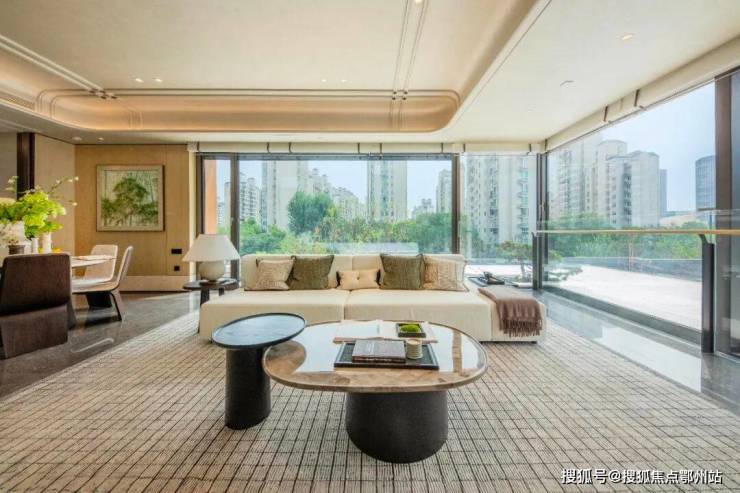 难得的是,项目外立面采用大尺度的 全超白高透钢化夹层玻璃打造,光是单块玻璃就重达2.5吨, 部分户型约12米连续无柱化设计,搭配270°转角全景视野,呈现出入画般的视野纵深。