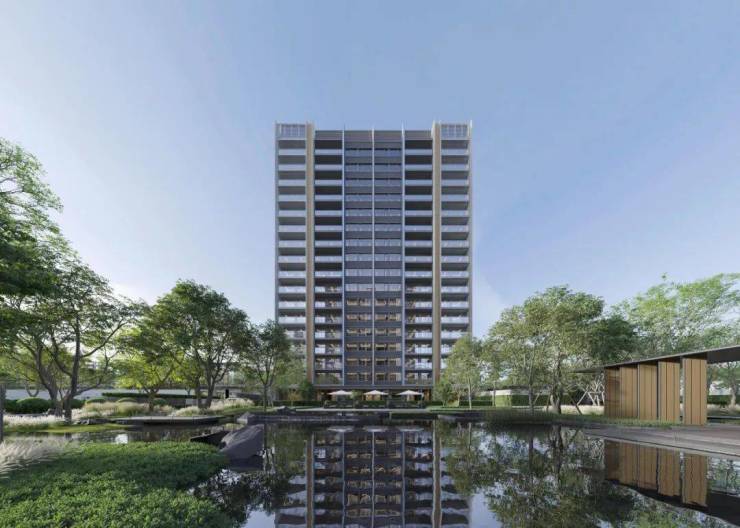 从园区入口到园区景观、建筑外立面、架空层、单元入户,再到样板房...几乎就是一场360度呈现的产品力「环幕大片」。因为南临一线东沙湖拥有得天独厚的水系自然资源,项目景观借鉴曼谷四季酒店设计灵感,在社区人行入口、中央景观、核心节点区域铺陈多处水景,将整个小区打造成一座“微缩的东沙湖”。