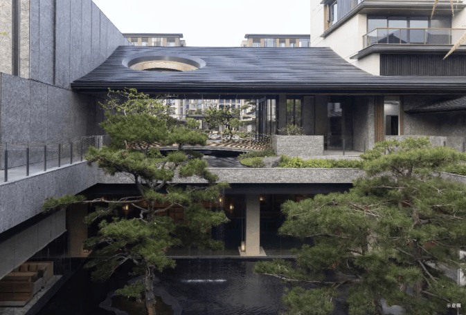 五株黑松以苍劲之姿构成「黑松叠景」,每一株都是跨越山河的生态艺术品,在古朴素简的山水画卷中,感受现代东方下的半隐秘境。
