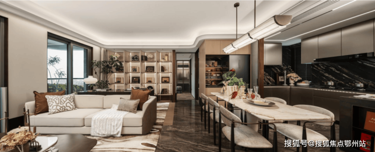 吊顶采用一体化大平顶加回型吊顶设计,并且在四个角均匀做了圆弧处理,让整个空间感更加和谐圆润。