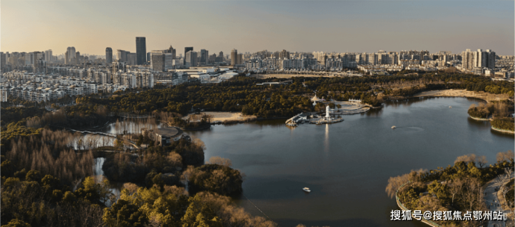 落日时可挽着爱人,一边漫步湖畔遛娃遛狗,一边看天边余霞成绮,湖中碎光点点,人与自然融为一体。